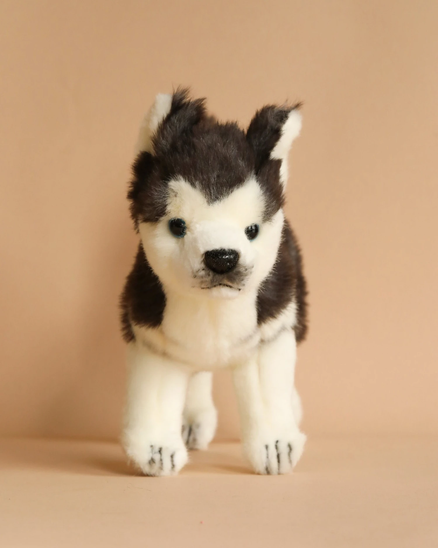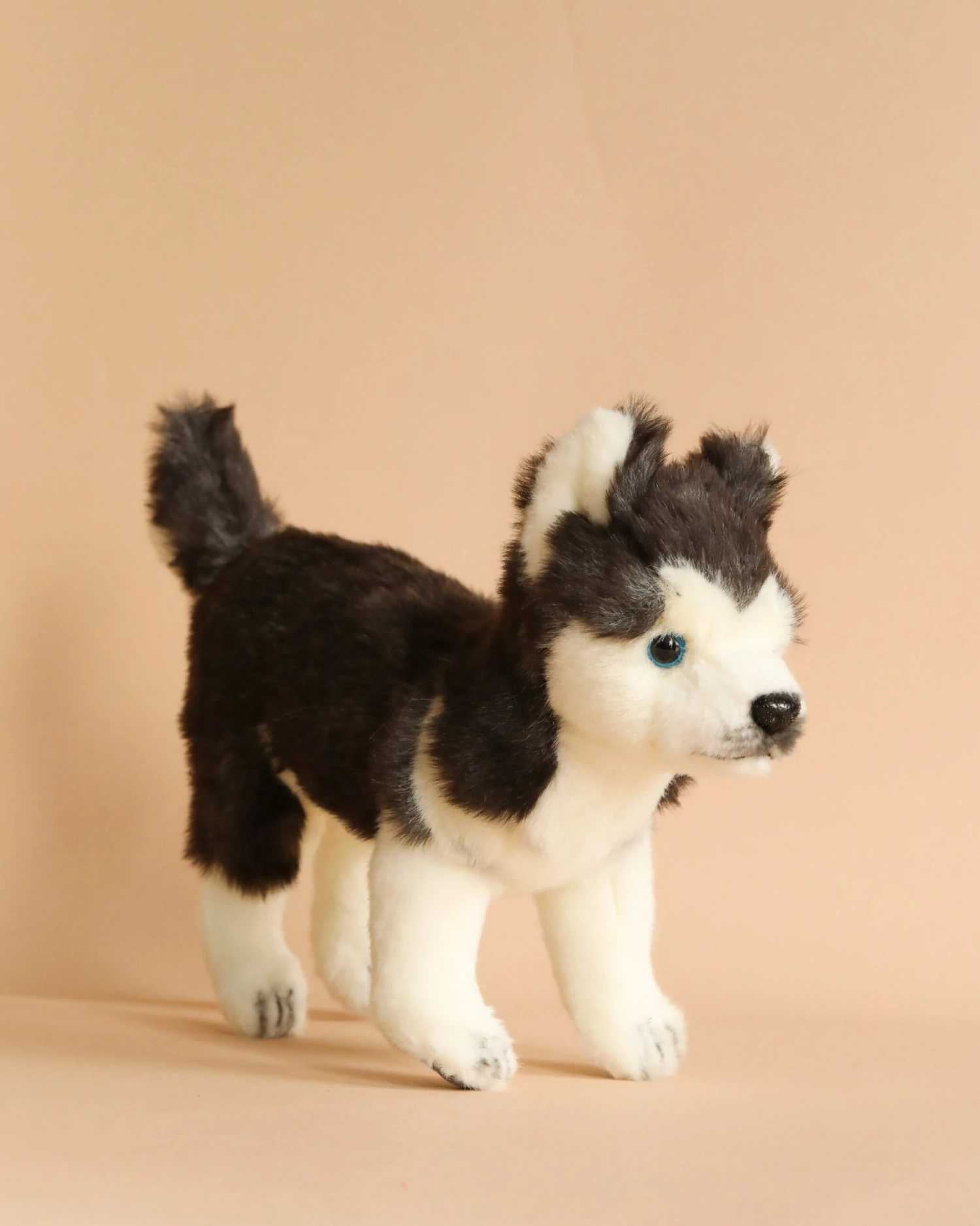 Artisan hand sew the animals “inside out”, an old world tradition that results in the mininization of seams, and their bodies are carefully “sculpted” to create “musculature” and “features” like movement in a walking or sitting position that are unique to each creature. On average, there are 42 separate pieces required to make each animal, that must be combined by a team of truly creative artists to create the distinctly realistic features that characterize HANSA animals. (Some animals have as many as 240 different parts!) Each animal is individually hand sewn, to give it a unique “personality”, there are more than 860 different fabrics and man-made furs from which the “coat” and “hides” are made, along with over 6000 sets of different eyes, whiskers, claws, noses, and related accessories allocated for creating these wonderful plush animals. Stuffing emphasizes careful attention to the placement of the highest quality man-made materials.