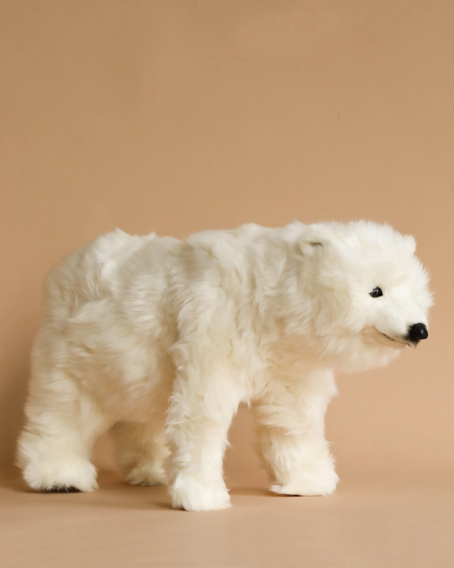 Artisans hand sew the animals “inside out”, an old world tradition that results in the mininization of seams, and their bodies are carefully “sculpted” to create “musculature” and “features” like movement in a walking or sitting position that are unique to each creature. On average, there are 42 separate pieces required to make each animal, that must be combined by a team of truly creative artists to create the distinctly realistic features that characterize HANSA animals. (Some animals have as many as 240 different parts!) Each animal is individually hand sewn, to give it a unique “personality”, there are more than 860 different fabrics and man-made furs from which the “coat” and “hides” are made, along with over 6000 sets of different eyes, whiskers, claws, noses, and related accessories allocated for creating these wonderful plush animals. Stuffing emphasizes careful attention to the placement of the highest quality man-made materials.