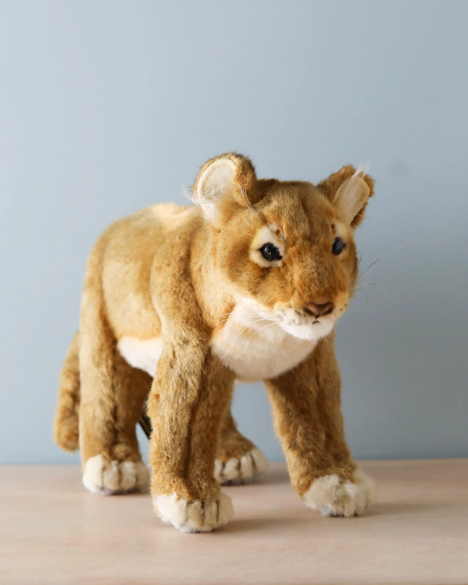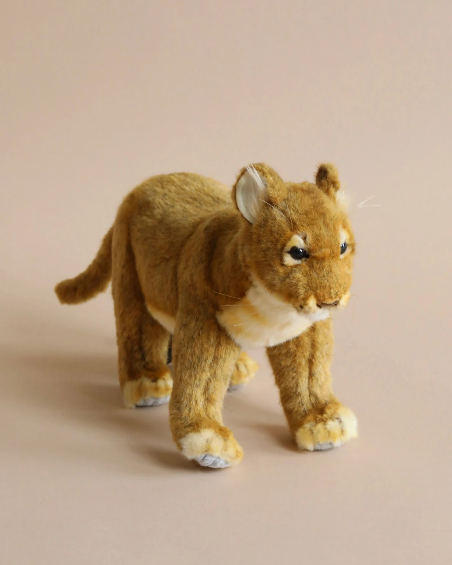 Artisan hand sew the animals “inside out”, an old world tradition that results in the mininization of seams, and their bodies are carefully “sculpted” to create “musculature” and “features” like movement in a walking or sitting position that are unique to each creature. On average, there are 42 separate pieces required to make each animal, that must be combined by a team of truly creative artists to create the distinctly realistic features that characterize HANSA animals. (Some animals have as many as 240 different parts!) Each animal is individually hand sewn, to give it a unique “personality”, there are more than 860 different fabrics and man-made furs from which the “coat” and “hides” are made, along with over 6000 sets of different eyes, whiskers, claws, noses, and related accessories allocated for creating these wonderful plush animals. Stuffing emphasizes careful attention to the placement of the highest quality man-made materials.